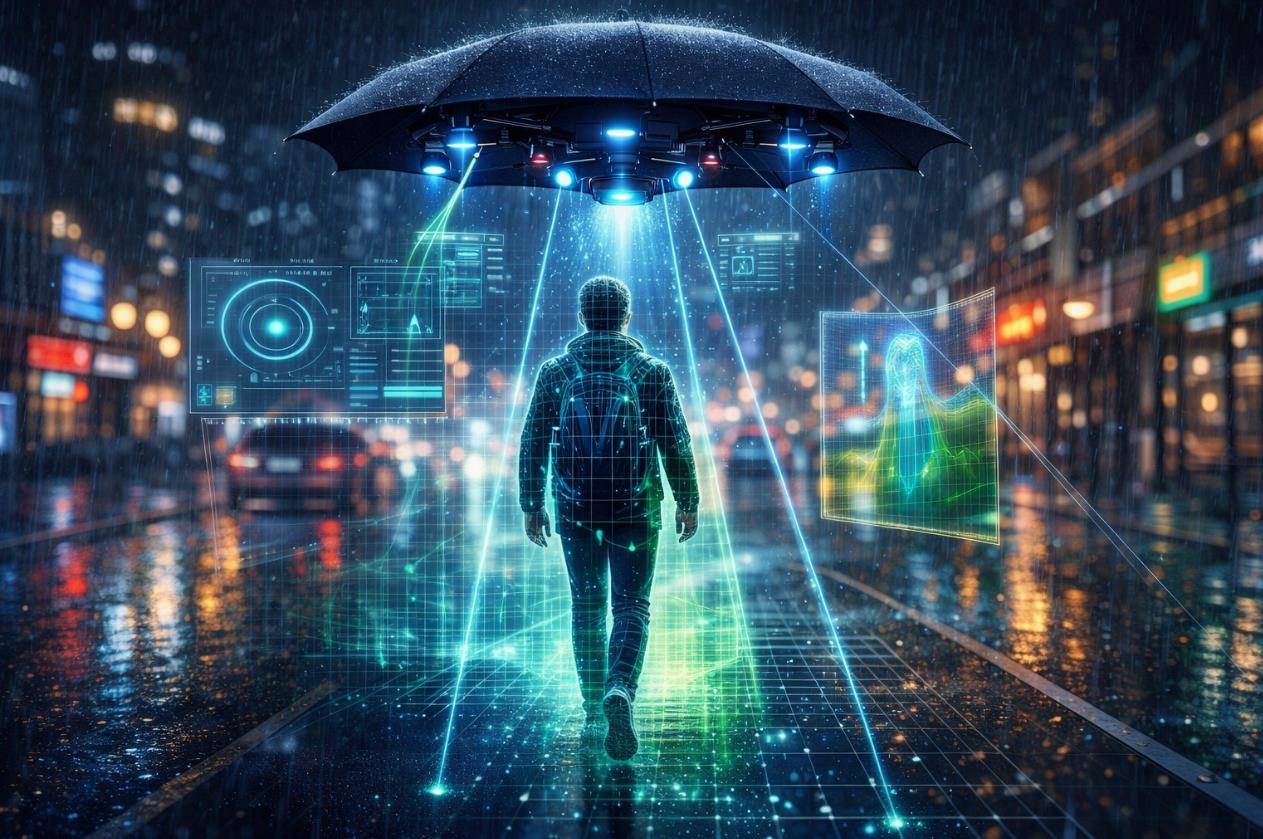 키워드: 자율비행 우산, 드론 우산, AI 추적 우산, ToF 카메라, 자율 이동 기술, 스마트 우산, AI 생활 도구, 드론 기술, 비전 인식 AI, 미래 생활 기술